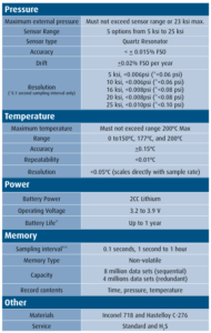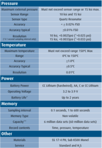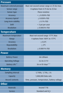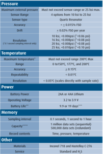 - 6 million data sets are achievable based on a 1 second sampling interval but may be limited by battery capacity available and temperature of operation (60 million data sets are achievable based on a 0.1 second sampling interval but may be limited by battery capacity available and temperature of operation).